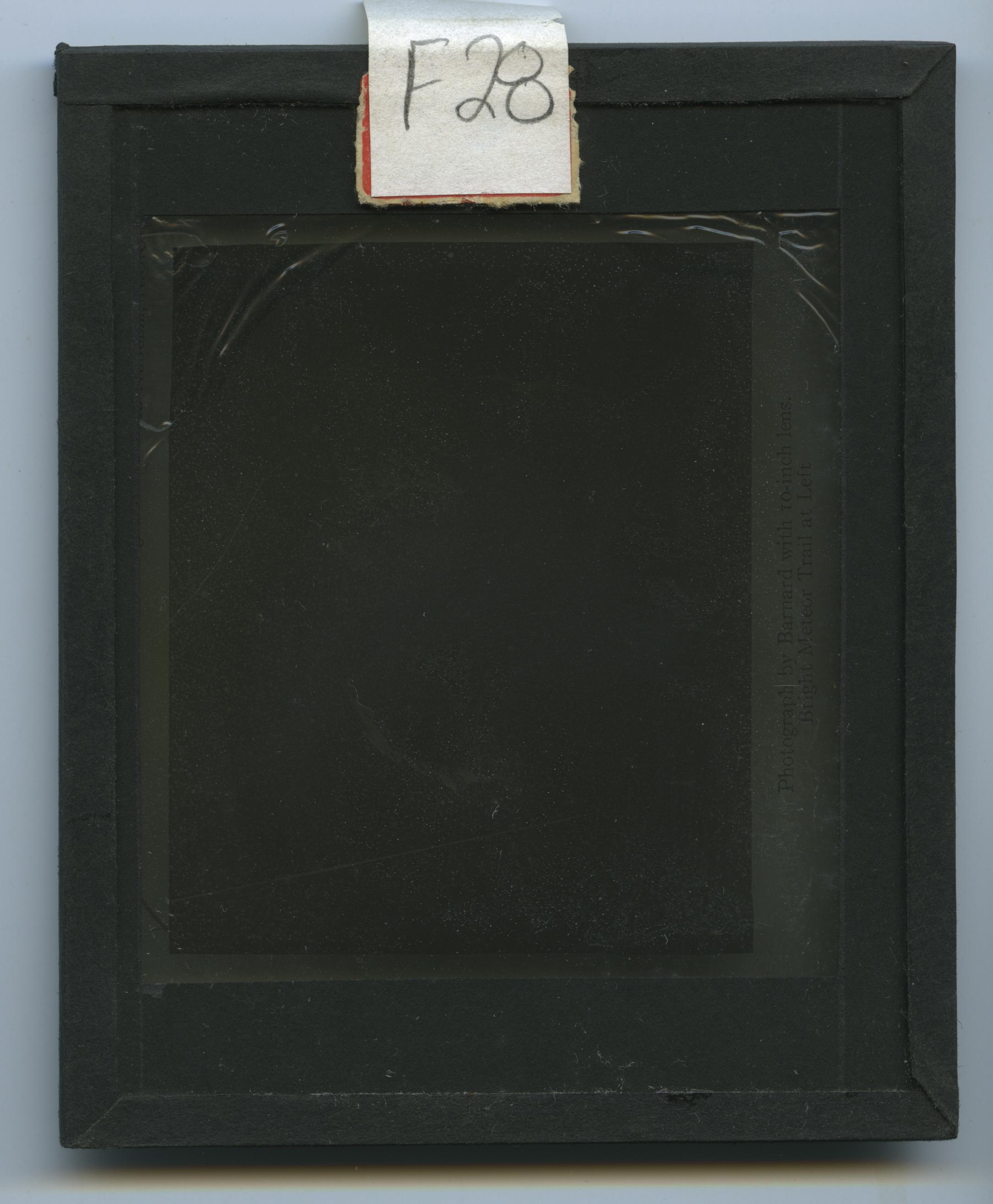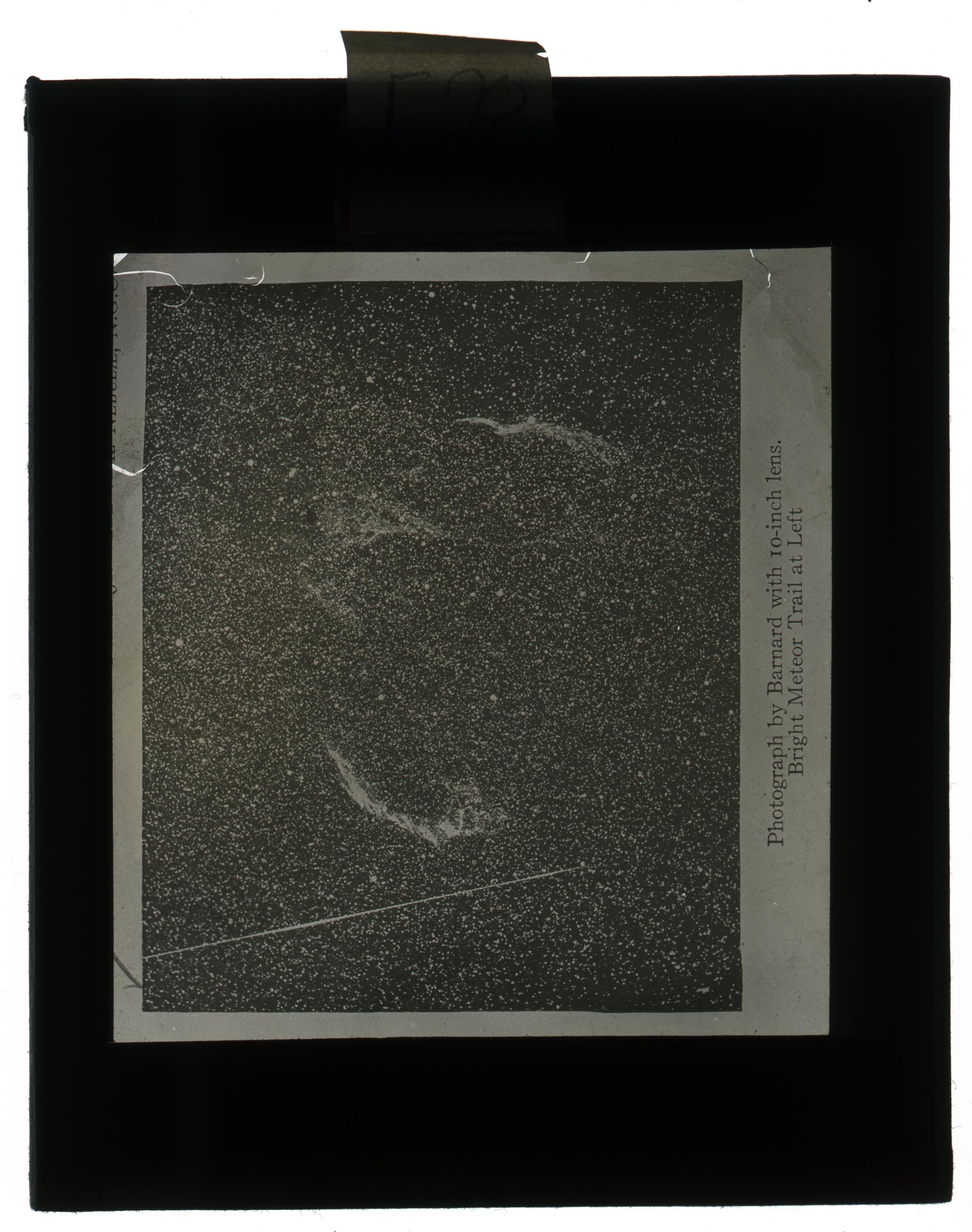 This is a capture taken by Edward Emerson Barnard. We see a dense star field, what seems to be a nebula, and a bright line that seems to be a capture of a meteor.