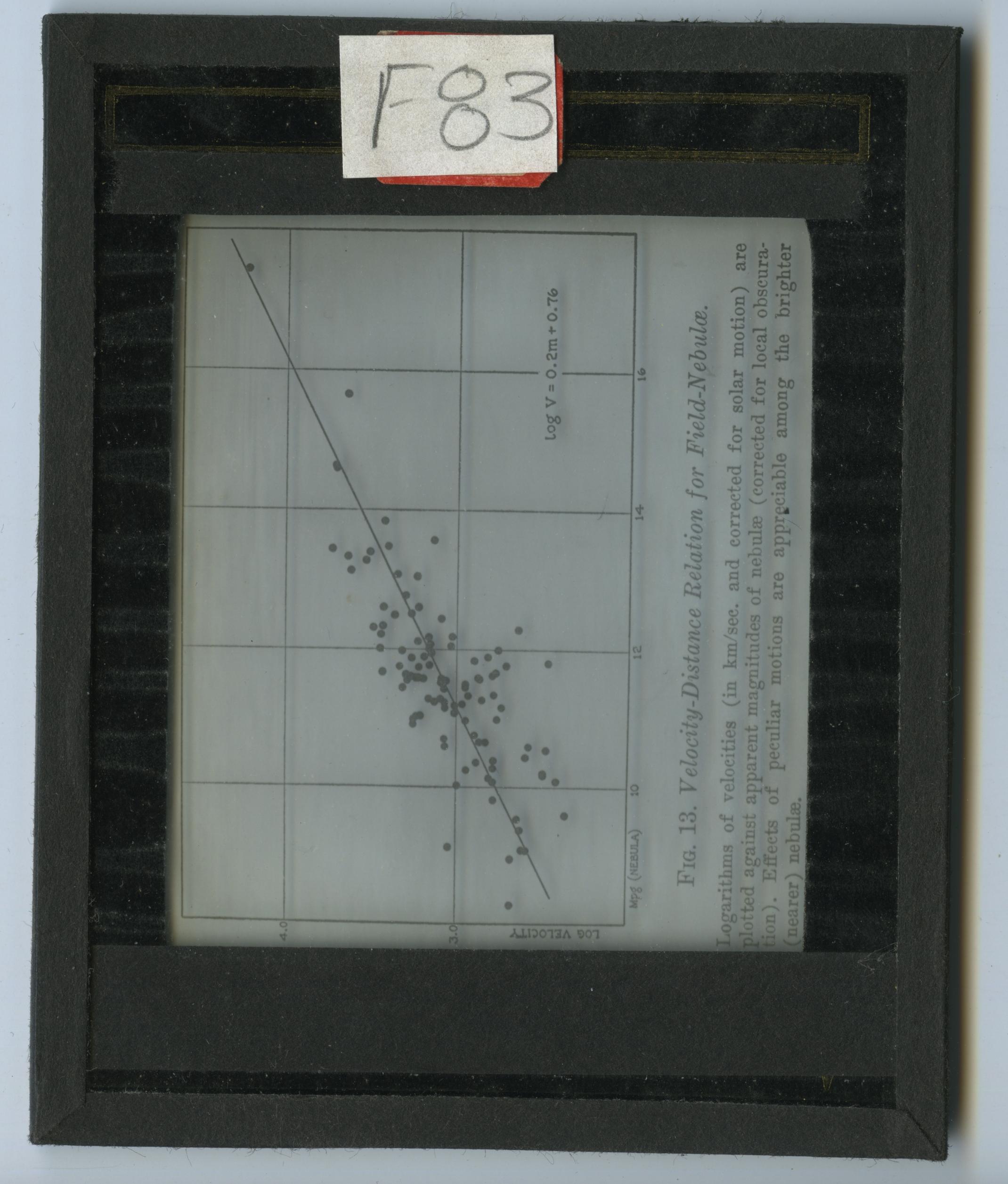 This is a teaching slide. It contains a plot of the logarithm of velocity against magnitude of various nebulae.